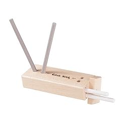 The sharpener contains four ceramic rods, a dark gray coarse pair and a white fine pair, which are stored conveniently in the wooden body (which is a nondescript, varnished hardwood of the type found in cheap folding furniture, for example.) In use, these rods would be inserted into two pairs of holes drilled into the wooden case. The holes serve to hold the rods at a particular angle, letting you create properly shaped, repeatable edges on your knives. How to use it: