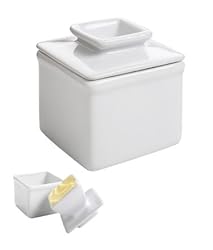Keep butter fresh and easy to spread with this handy porcelain butter crock. It holds one stick of butter safely without refrigeration for up to 7 days. The water creates an airtight seal and your butter stays soft and easy to spread. Dishwasher safe. 4 inches h.