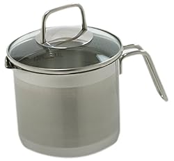 (More customer reviews)I had been looking everywhere for a pot like this. My son lives in Germany and has one almost like it (without lid). It is used every day. I tried to find one in Germany, and so far have brought 2 home. Neither have been exactly what I wanted. I have also looked for this in many department and kitchen stores - no luck. I found the same Multi-Pot on another web site without the lid and at twice the price before I found this one. (I ordered 2 from that site because I was so excited). When I found this one on the Amazon site, I ordered 2 more, then I ordered another 2 for wedding presents. This is a stainless steel pot with a bottom that distributes the heat evenly so you don't get the hot-spotting that can occur with just stainless steel. The pot is a good weight and the handle is sturdy and does not wobble when the pot is filled with water - a problem I encountered with one of my German pots. I use the pot to heat up water, make sauces, hard or soft cook eggs, cook vegetables, and for many other things. The more I use this pot, the better I like it. The straining lid was an added bonus. I do clean the pot and lid by hand, and do notice that water sometimes stands under the hardware of the handle, taking a while for the lid to dry. Aside from that, this is really a neat little pot and, I keep finding new uses for it every day. Measuring lines are etched on the inside of the pot. Try it - you really can't lose at this price.