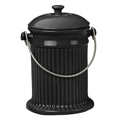Black Ceramic Stoneware Counter top Compost Pail Made of fluted, ceramic stoneware 11" H x 7" in diameter Generous one gallon capacity Holds several days' worth of kitchen trimmings and scraps Sturdy bail handle makes it easy to carry to the main compost bin 2 charcoal filters inside lid help prevent unwanted odors from escaping 2 replacement filters included (can last up to 4-6 months) Dishwasher safe (please remove filters before washing) Beautiful enough for the kitchen counter and practical, too !