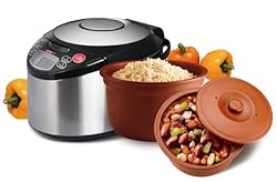 With the use of computerized clay-heating technology, this fully programmable 6-cup multi-cooker works great for making 30-minute meals, pasta dishes, steam and whole-grain rice, hearty stew, and more. The appliance provides an all-natural clay cooking pot made of mineral-rich Zisha clay, which enhances the flavor and texture of food and preserves essential nutrients. Due to its slightly porous nature and low thermal conductivity, the clay pot absorbs heat while maintaining a steady temperature--perfect for making rice or slow cooking. The cooking pot also offers a naturally nonstick, unglazed design, which means no nonstick chemicals coming in contact with food. Choose from four pre-programmed settings--regular rice, brown rice, stew, or soup. The cooker quickly brings food to a boil--up to four times faster than conventional slow cookers--then reduces the heat to a simmer for the desired time. Other highlights include a cupped heating pad to promote uniform cooking, automatic keep warm for up to 12 hours, a large LCD and 24-hour clock display, and an easy-to-clean design. The cooker measures approximately 10-3/5 by 9-4/5 by 14-2/5 inches and carries a one-year limited warranty.