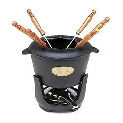 Constructed of sturdy cast iron, the hardy pot rests atop a broad cast-iron base for stability, and its open pedestal reveals a small burner that holds ingredients at their optimal temperature for serving. Designed only to hold the temperature of prepared sauces and not for cooking raw meats or vegetables, the unit should not be placed in the oven or on the stovetop. Two integrated handles on either side ensure safe transport from the kitchen to the table, enabling a firm grip even when carried with cumbersome oven mitts or potholders. Additionally, its cast-iron lid aids in heat retention and sports a cutout-style center that hosts six included dipping forks. Fitted with wood handles for comfortable use, the forks also feature color-coded tips, which allow family members or guests to quickly identify their utensil. Best of all, the pot and corresponding pieces clean up easily by hand with warm, soapy water, and recipes come included for creating fondue-based delicacies.