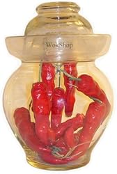 The traditional way of pickling vegetables and fruits in China is finally available in USA. The rim holds water and the glass lid is placed upside down into the water to create an air-tight jar; vacuum sealed without a rubber gasket or any metal screw top, creating a simple, clean seal. Clean, clear, see-through glass with 3" opening.Capacity/Dimension:132oz / 11" h x 7.5" dia.