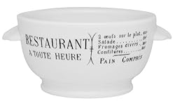 A true French classic, Pillivuyt's Brasserie Eared Onion Soup Bowls are exceptional in their finishing detail. With its classic French café menu pattern it is a wonderful addition to any kitchen. This pattern was created in the 1920's for restaurants and cafes that wished to have their menus on their dinnerware. The Brasserie pattern retains the original French menus with prices! The design is printed on a decal and then applied by hand, which requires patience, a steady hand and great attention to detail. After the decal is applied, the piece is fired for a third time and the design is baked into a hard coating of glaze, making it permanent and impervious to scratching or wearing off. All Pillivuyt dishes are made with Pillivuyt's proprietary porcelain recipe. The "ear" handles are a traditional design and allow you to hold and carry the dish easily; the glaze, as in all Pillivuyt items, will not craze, stain, or discolor, and cleans up with amazing ease. The 15 ounce, Eared Onion Soup Bowl is another addition to the single-serving options. Ideal for serving soup or making individual servings of pasta and casseroles. This is a nice-sized dish for small-meal presentations. Pillivuyt porcelain is the finest culinary porcelain in the world. This bowl epitomizes Pillivuyt's exceptionally fine detailing. Use this classic on the dinner table with your finest china. It is dishwasher-safe and resistant to scratching and chipping. All Pillivuyt products are lead and cadmium-free and guaranteed 100% food-safe. Pillivuyt porcelain is hand-crafted by artisans in a French factory that was family-founded in 1818.