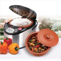 Totally convenient and fully programmable, this easy-to-use 6-cup rice maker and slow cooker features innovative computerized clay-heating technology. Its all-natural clay cooking bowl, which rests on a cupped heating pad for uniform cooking, captures fresher flavor and uses 50-percent less energy. The slightly porous clay allows it to breathe during the cooking process, retaining moisture and essential nutrients, plus its unglazed surface means no nonstick chemicals coming in contact with food. Pre-programmed settings include perfect rice, nutritious whole grain/brown rice, sweet rice, and slow-cooked meals. The cooker quickly brings food to a boil--up to four times faster than conventional slow cookers--then reduces the heat to a simmer for the desired time, sealing in flavor. Other highlights include a 24-hour programmable timer and a double-lid design that creates micro-pressure cooking to maximize steaming quality. Perfect for busy professionals and families who want the healthy nourishment of a home-cooked meal, the rice and slow cooker measures 14-3/8 by 10-5/8 by 9-5/6 inches and carries a one-year warranty.