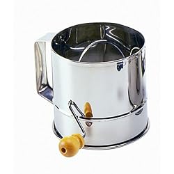 This stainless steel flour sifter with crank has a 3-cup capacity. Used for sifting flour evenly and lightly over dough. Medium fine stainless steel mesh. Heavy duty rotary crank mechanism Polished stainless steel construction.