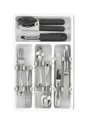 Kitchen drawers can quickly become unruly without the use of some sort of drawer organizer. This thoughtfully designed kitchen accessory works great for keeping utensils organized and neatly stacked. It slides easily into almost any kitchen drawer and expands from 9-3/4 to 16-1/4 inches to take full advantage of larger-size drawers. The unit provides three sections for forks, knives, and spoons. Removable dividers keep the utensils neatly stacked, even when opening and closing the drawer, plus they allow for storing two stacks in each section by facing them in opposite directions. The dividers adjust to accommodate utensils of all shapes and sizes, or they can be removed all together for more open space. Simply pinch the side walls of the dividers to slide them in or out. In addition to the three utensil sections, there's also a compartment for storing miscellaneous items, like a can opener and a carrot peeler, plus an expandable section for longer tools and gadgets like spatulas, tongs, basting brushes, slotted spoons, and more. Non-slip feet prevent the organizer from shifting in the drawer, and the unit can be wiped down with a damp cloth to clean as needed. The expandable utensil organizer measures 15-1/4 by 9-1/2 to 16 by 2 inches.