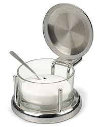 Dinner is served..with style ! Keeps salt fresh and handy. Brand new in box Durable 18/10 Stainless steel frame 8 oz glass bowl 2.5" H x 3.75" W x 5.5" D Flip top lid has a silicone gasket to seal in freshness Includes matching stainless steel serving spoon Classic style meets practical function in this elegant serving piece Note: This piece is dishwasher safe, but we recommend hand washing to protect glass bowl