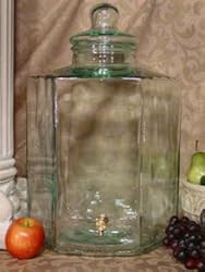 Verona Grande 650 oz Infusion Jar - Clear glass jar with recipe booklet and plastic/rubber gasket for the lid - A great Infusion jar for any occasion! The largest spigot jar available anyware at 5 gallons. Green, handmade glass and hexagonal shape like other Verona jars. Can be used for vodka infusions, sun tea jars, lemonade jar, and other types of beverage dispensing.