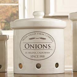 Inspired by handmade crocks of the late 1800s, our rustic canisters are crafted of hand-painted earthenware and generously sized for bulky vegetables. Decorated labels are large and easy to read on pantry shelves. With snug lids and ventilated cutouts along the base, this is a charming way to keep produce fresh and handy. Exclusive. Dishwasher-safe.Product Features Hand-painted earthenware Farmers Market-inspired decal labels Ventilated base keeps produce at its best Garlic: 5 3/4" Dia. x 6 3/4"H Onion: 7 3/4" Dia. x 8 1/2"H Potato: 9" Dia. x 9 3/4"H